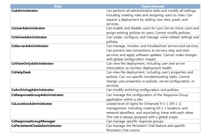 To enable you to delegate administrative tasks while maintaining high standards for security, Lync Server 2013 offers role-based access control (RBAC). With RBAC, administrative privilege is